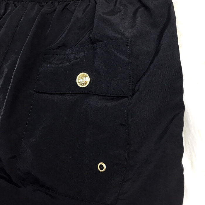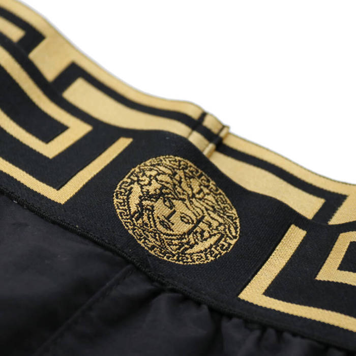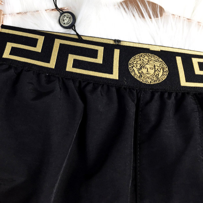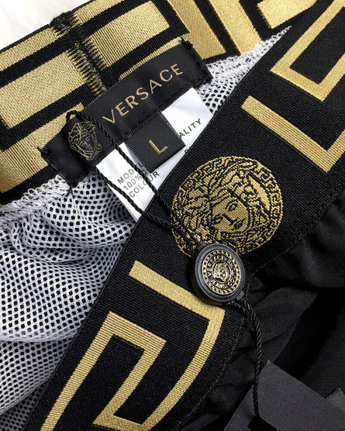 Costume Versace dal design audace, stampa barocca iconica, tessuto di alta qualità, perfetto per un look elegante e lussuoso in spiaggia.